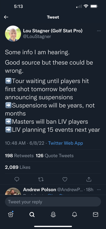 Look for word after tee off tomorrow. A ban is coming. I hear years. Also Augusta out except for past champs rule. Us open futures are out. This will get ugly it looks. This is coming from a former usga board member.