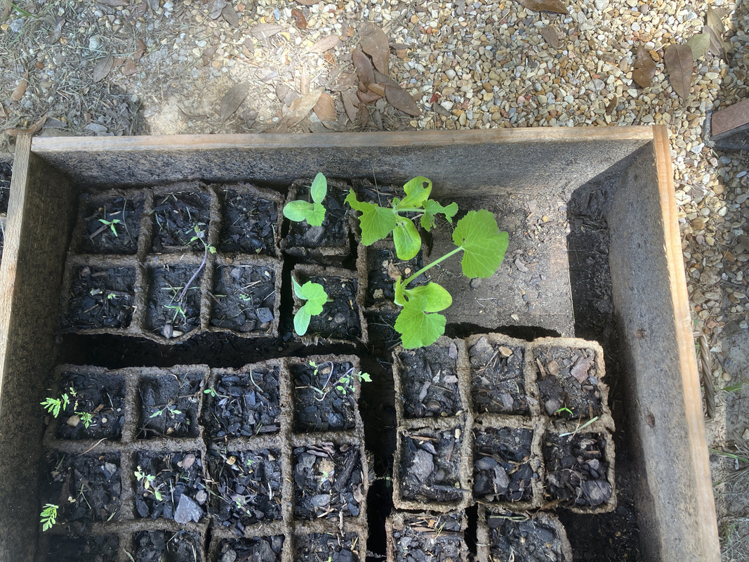 It rained pretty good at my place yesterday. Good morning to pull some weeds with the ground being soft. The jalapeños look good. The first round of cabbage is slowly growing, putting on their first true leaves finally. And the butternut and cucumber vines are really taking off!
