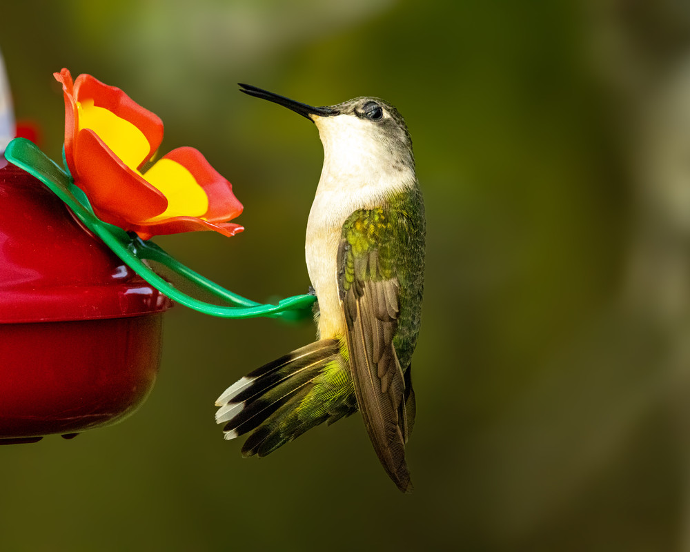 A lone bird guarding a second feeder.