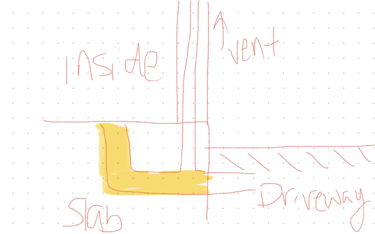 By your drawing, it’s pretty straightforward. But the simplest way is still going to be cut the concrete as close to the wall as you can cut it. Bearing in mind, you’re only cutting a notch that’s 7”-8”s wide. Then you can hammer out and down through the concrete. But you do want to be several inches below ground when you breakout of the slab. That way you avoid exposing the pipe when you backfill on the exterior.
