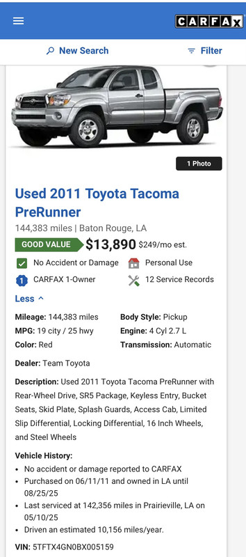 I’m also ignorant on this as I’ve never bought via this method, I just googled high mileage Tacomas at $15K and that popped up. I assume this vehicle might have been a trade in and is likely at a dealership in the Baton Rouge area but here is the link