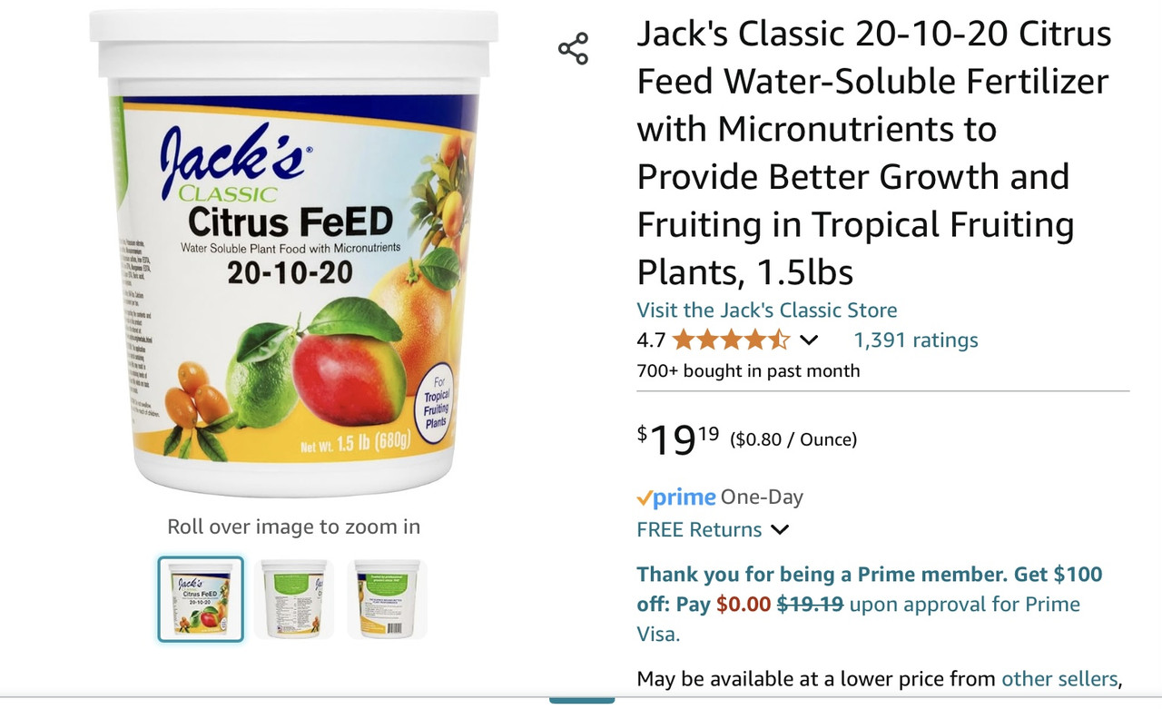 For potted citrus, I use this water soluble fertilizer, ordered from Amazon, monthly plus I also use Osmocote slow release fertilizer (you can buy that at the big box stores) of similar nutrient composition, perhaps 2 or 3 times from spring to fall - just follow labeled directions as to the amount to add. The key to these fertllizers are the micronutrients they contain which are important for potted plants. For in-ground citrus, just a standard garden- vegetable fertilizer.