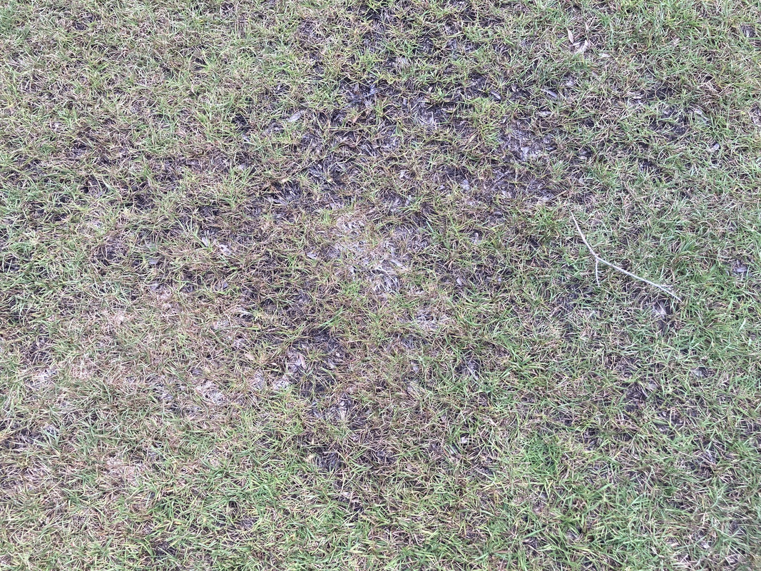Compacted soil. Aerate and top dress with sand.