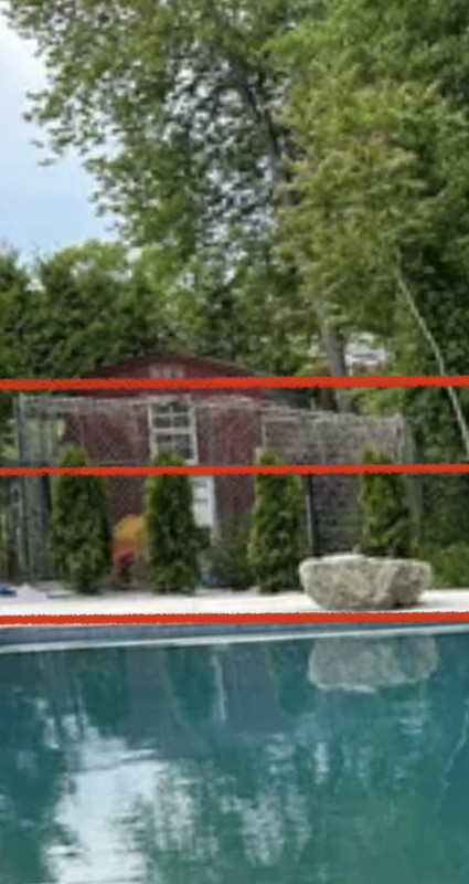 Shed is the key to the puzzle. If you use it as your reference, the pool is actually level and the water is crooked.