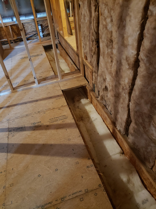 I built the house with radiant OSB for the roof sheathing and the bonus room has a 5' knee wall surrounding its perimeter that slopes up to 9' ceilings at the top. There is some attic space above the 9' ceiling, but it will be inaccessible once the room is completed. The room sits on 16" i-joists with 1 1/4" subflooring. In between the joists there is some relatively thick (about 5") unfaced insulation that runs the length of the joists.