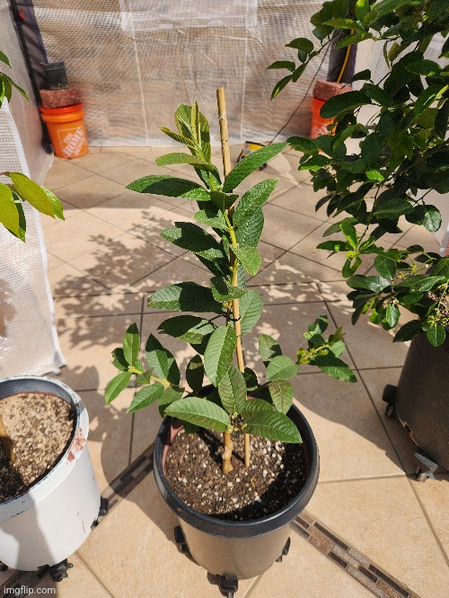 Mexican cream guava pushing new growth after a bare root and repot process.