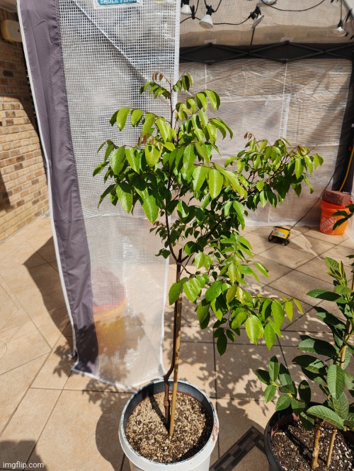 Kari starfruit / carambola recovered from shipping, bare root, and repot. Starfruit are huge drama queens and there were like 5 leaves on this 3 weeks ago. Also needs significantly acidic soil and foliar nutrients.