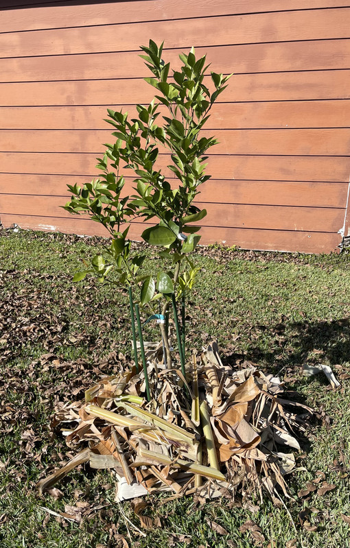 I also read that banana leaves make excellent fertilizer and mulch so I chopped them up and mounded them around the banana base and around my clementine mandarin and two naval orange trees which were planted in early fall.