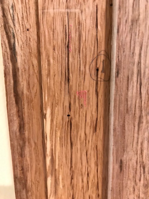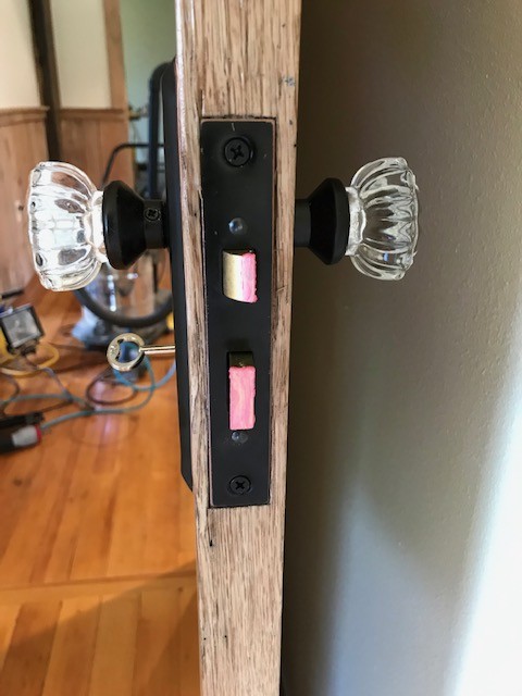 Closing the door, striking the dead bolt against the door frame to mark my spots. See the pink?