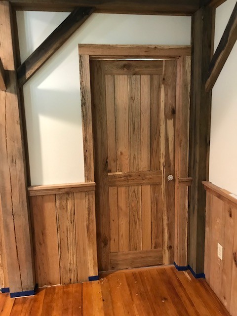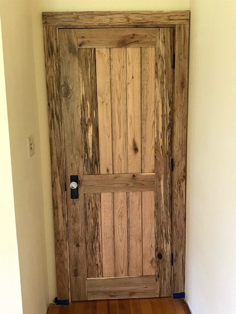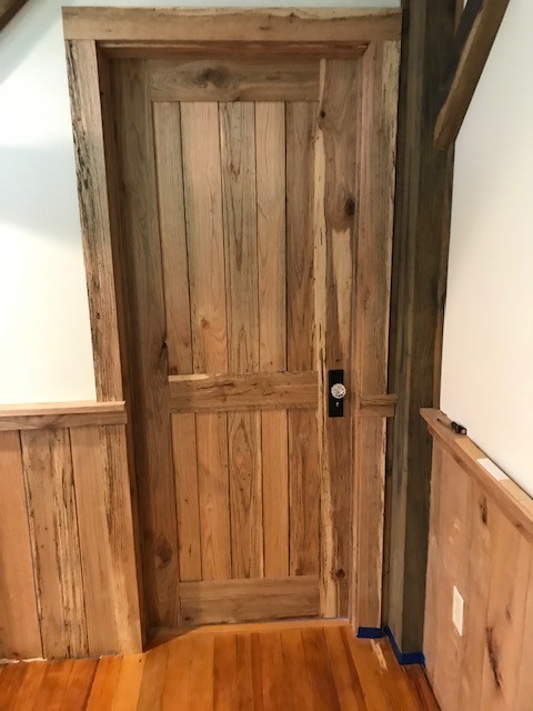 First was to install some 1 1/4"x 1/4" strips to block the door from a out swing and having the door flush with the inside of the room door frame.One can see that strip in the next picture.