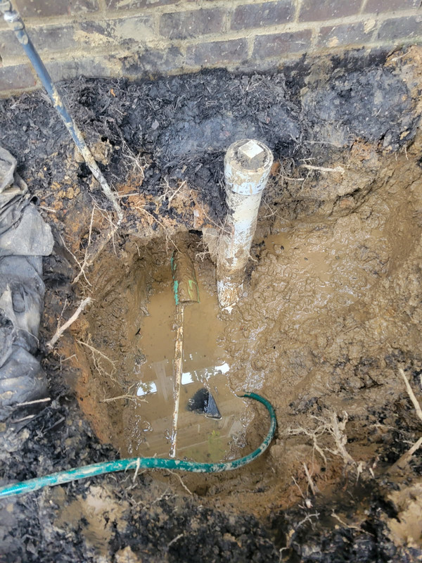 The PVC pipes are stacked going into the green pipe, plan this morning is for them to continue to dig out and then cut the green pipe as close or under foundation to hopefully find a broken linking cuppling