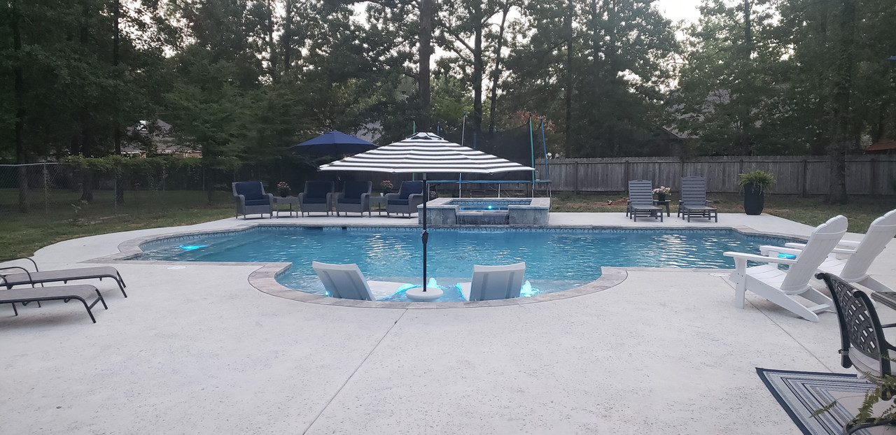 Just finished our's a couple of months ago. 18x40 rectangle sports pool. 15x8 layout deck with 3 LED bubblers. 7x7 spa. 7 total LEDs. All automated so I can control everything on my phone from anywhere. Silver travertine coping. Upgraded to a glass tile. 400k BTU heater. Top of the line pump and other equipment. Quartz plaster. over 1,600sq-ft of concrete decking. Dolphin Nautilus CC Plus pool cleaner. Came in just over $80k.