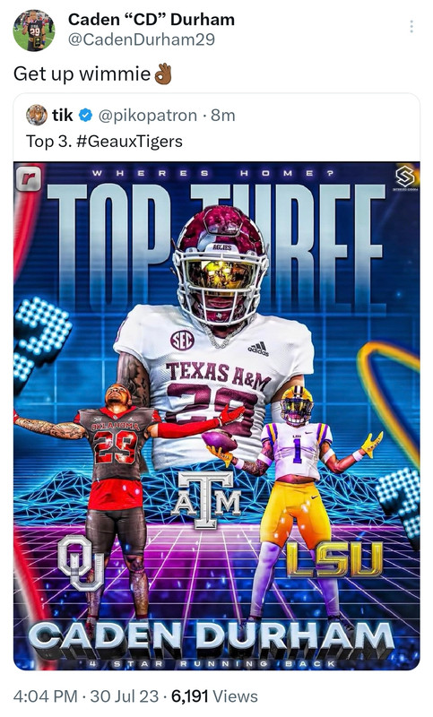 Feels like a troll of lsu more than anything. Announcing a top 3 that everyone already knew was your top 3 right after taking the lsu visit and all the momentum appears to be lsu