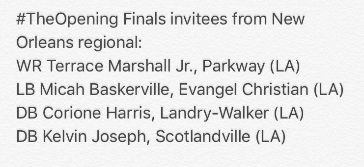 The Opening Regional in New Orleans on Sunday produced four invitations to the finals in July. Bossier City (La.) Parkway five-star wide receiver Terrace Marshall headline the group of invites.