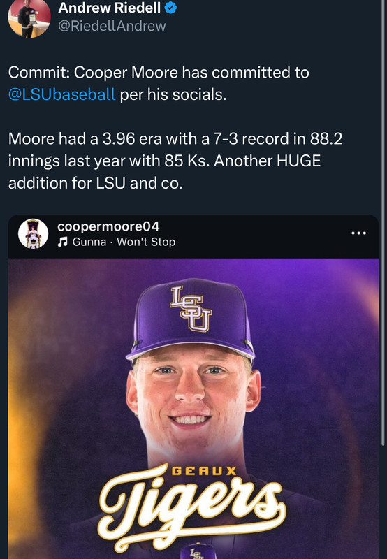 BREAKING: Kansas RHP Cooper Moore has committed to #LSU.