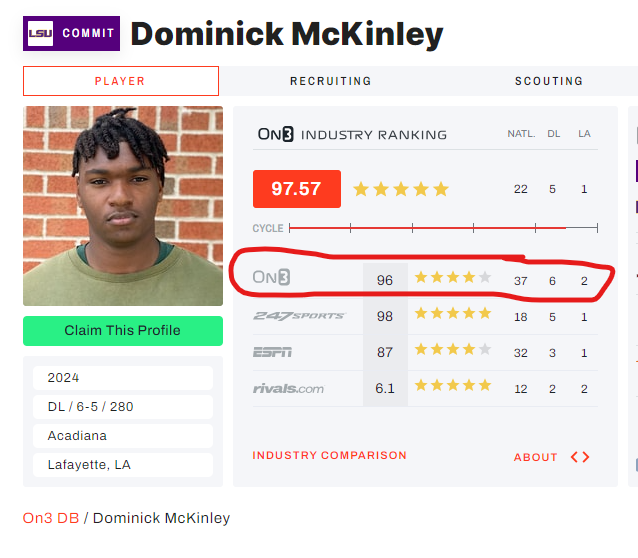 Five-star LSU defensive line commit Dominick McKinley finished as the No. 24 overall prospect in America, No. 3 defensive lineman in the country and No. 1 prospect in Louisiana for On3. The Acadiana (La.) defensive lineman is one of three On3 five-stars