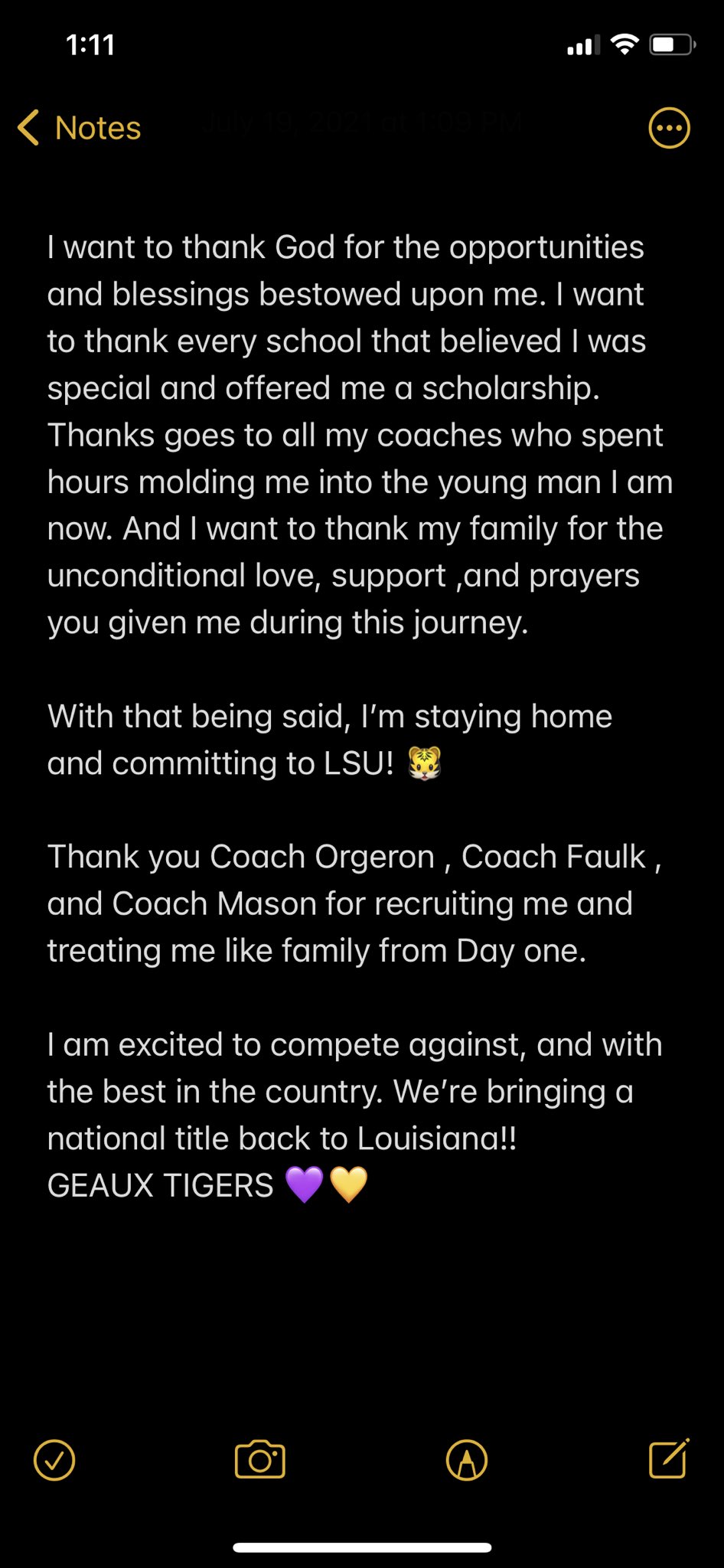 It’s not a big surprise he has been leaning LSU from day one. He knows it’s important for guys to stay in the state of Louisiana and win the ship. Geaux Tigers!