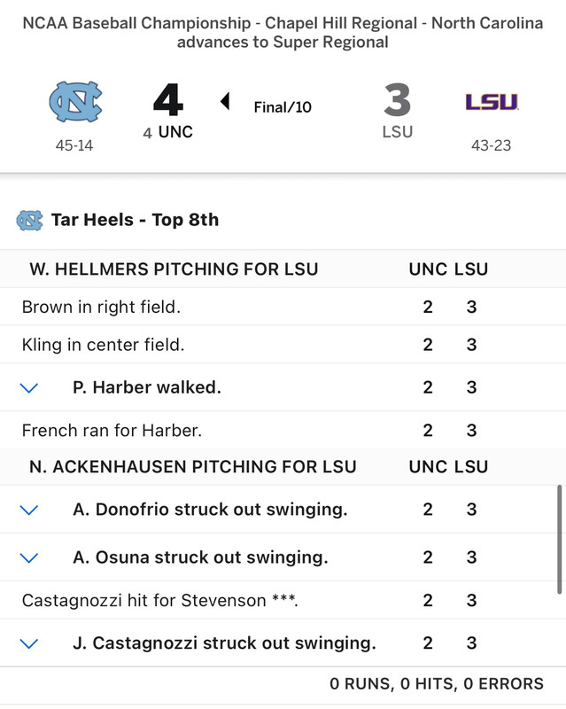I don't know enough about Dutton to comment on that decision. Johnson did make the right decision there of course with the quick hook...3 batters faced...none retired. However, I've seen some other posters say and I thought so also that Coleman would get the start. Of course the way Anderson had been pitching, he would have been the obvious choice but they had used him up in previous games...just like Griffin Herring. That is the problem coming from the loser's bracket and have to play that extra game.
