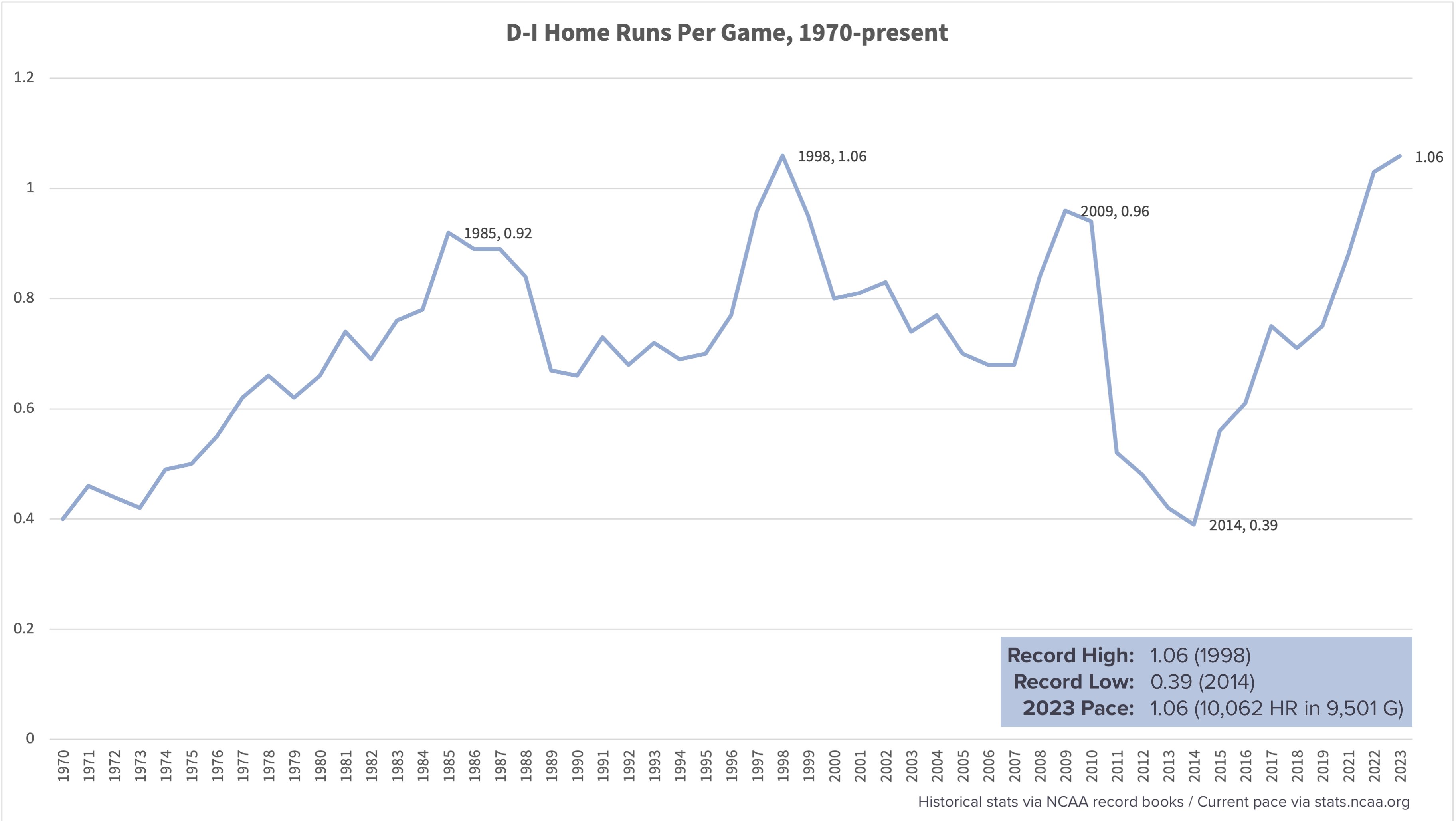 @fridaystarters Inspired by @aaronfitt observation on HRs from yesterday, here's a look at the D1 HR per game rate since 1970.