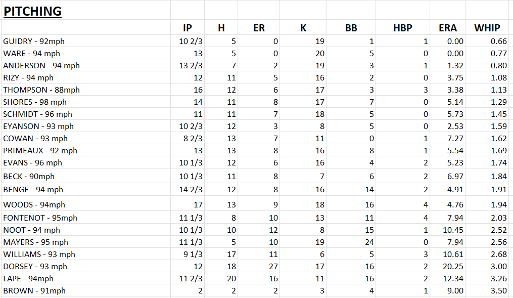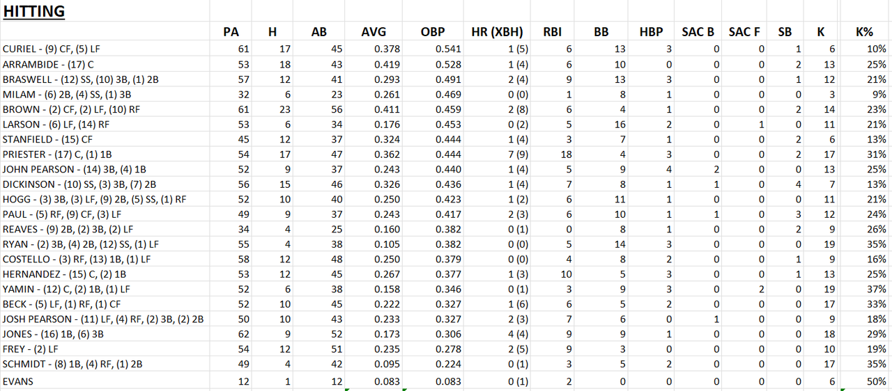 Hitting is sorted by OBP and pitching is sorted by WHIP. As I've said in the past, my WHIP includes HBP for pitcher. Technically that isn't correct but I like to include it to have a better idea of all base runners allowed per inning.