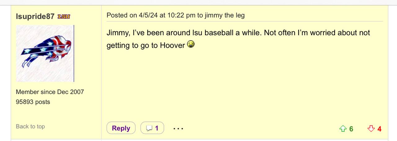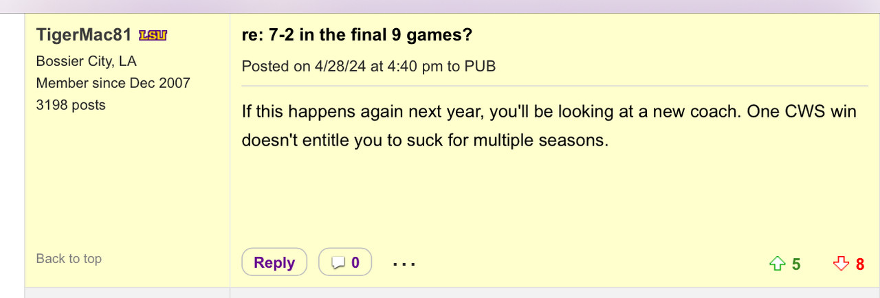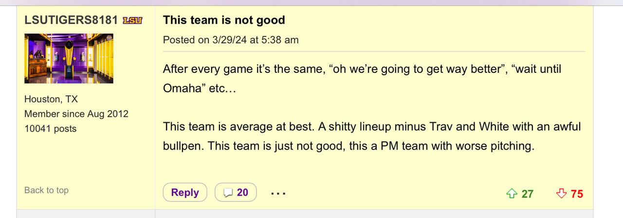 One thread a month ago was titled "Tired of travinskis shite" and had over 225 likes with everyone wanting him benched. Trav went 2 for 4 that day with a double and people were still bitching after the game. A month later, he was named to the all-SEC tournament team.