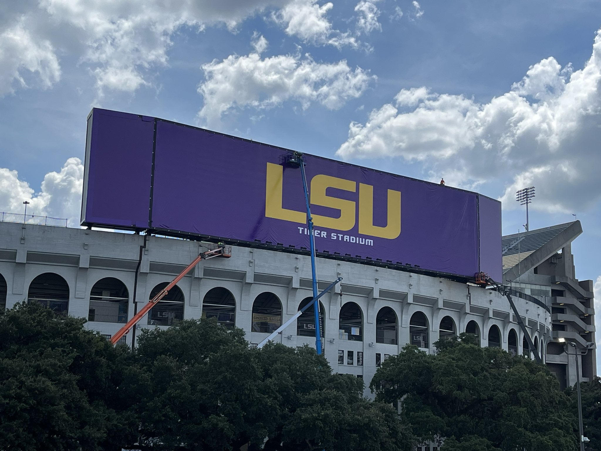 I was thinking about that weeks ago, not knowing what they would put. I wanted them to move LSU to the left and put the Tiger emblem on the helmet to the right. Now, since this tarp is up and LSU is quite small, maybe a Tiger emblem on each side for now