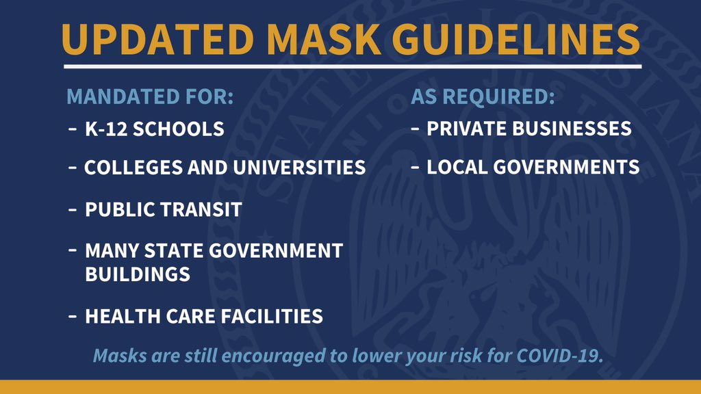 Other changes to the new proclamation @LouisianaGov has signed, effective tomorrow: - outdoor events will not have capacity restrictions - indoor events can go to 75% capacity OR 100% with mask enforcement