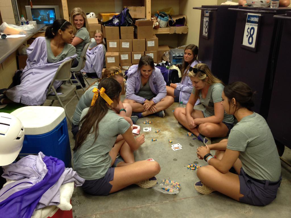 .@lsubaseball #BatGirls killing time during #raindelay with a game of #blackjack with #bubblegum @AdvocateSports