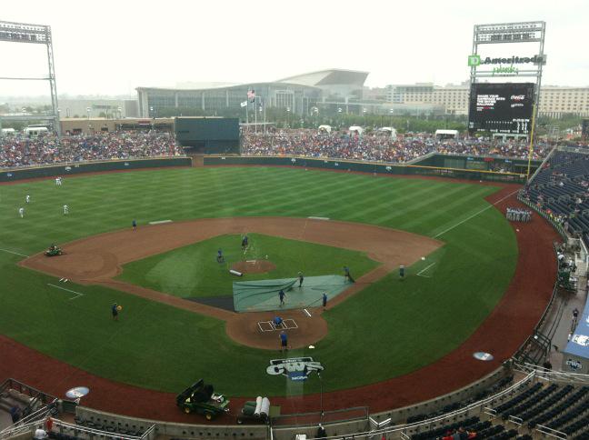 Rain is closing in on the ballpark. Nothing heavy, but wouldn't be shocked if there's a delay. Fans scurrying for cover. #LSU #CWS2015