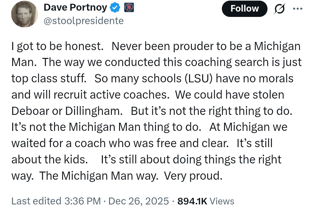 Edit: my statement was technically a bit incorrect. But the fact that Michigan waited longer than LSU to fire their coach and then start a search, doesn’t change anything. Portnoy is hot take piece of shite.