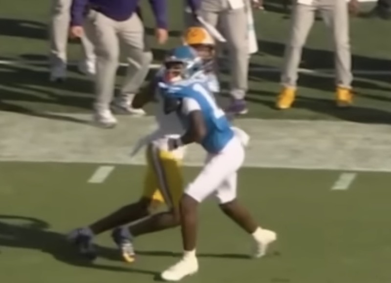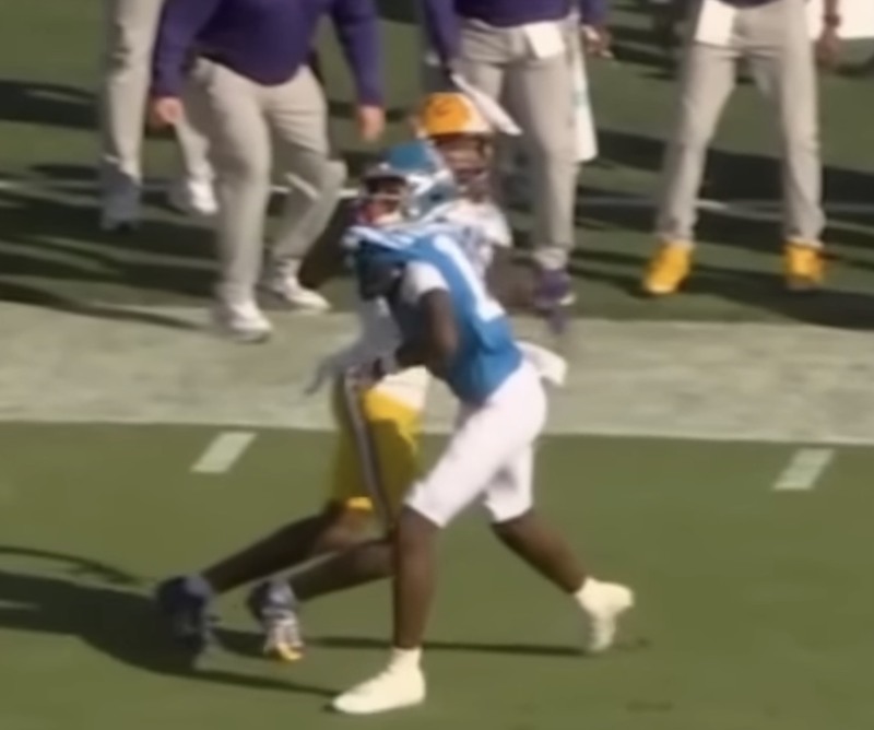4 picture sequence that happens within 2 seconds. Pickett played the ball well until he grabs the Ole Miss WR’s jersey on left shoulder and pushes him aside. If he doesn’t grab the jersey I believe there is no PI called.