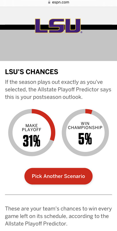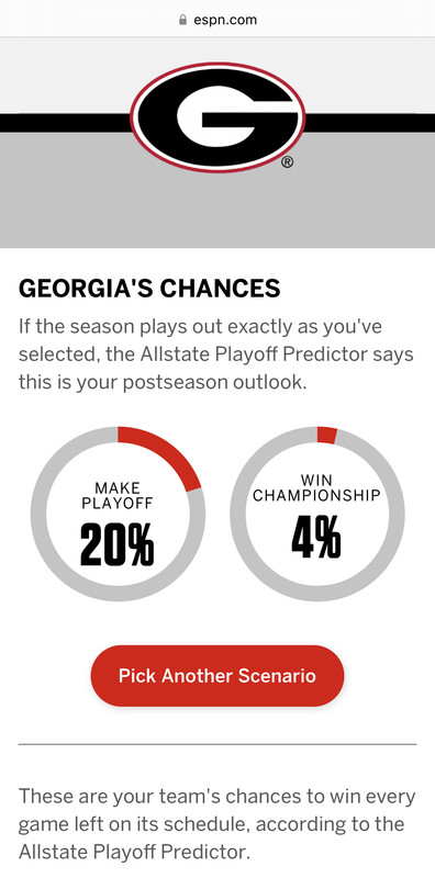 Ran the scenario for Georgia too where they win out and lose the SECCG and they’re at 20% so at least the generator agrees that LSU would be selected over them as the SEC representative in that scenario.