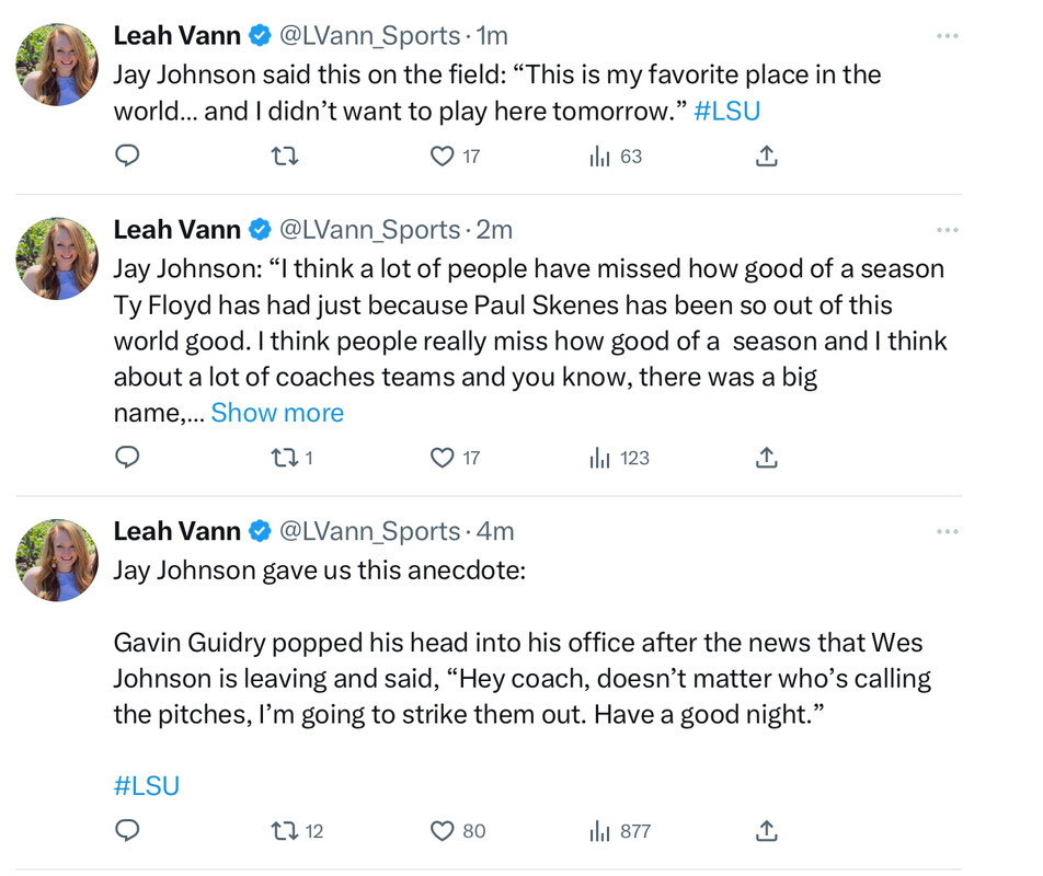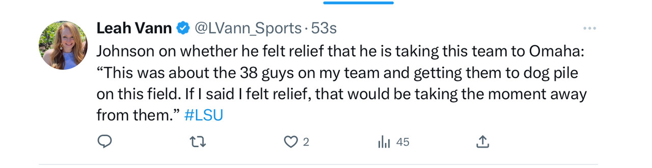 I can't tell you how many times people up here have come up to me while I'm in my LSU gear and say, 'I sure hope you guys make it here this year' 'We love your team. I hope they're here for the CWS' 'We need you guys here - it's just not the same without you' And on and on. The people up here love LSU baseball and will be so stoked to hear the baws are coming. They're almost as excited as I am!
