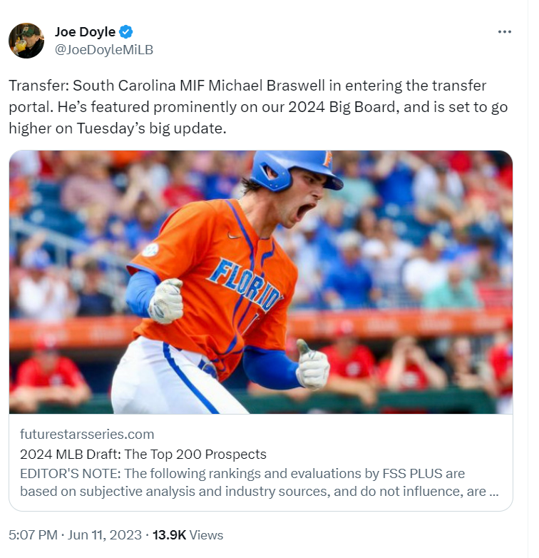 Braswell played at third, short and second base for USC in 2023 and hit .255/.372/.353 in 153 at-bats. The Mableton, Georgia, native is a surehanded defender who can play multiple infield positions but has yet to show power at the plate with three career home runs.