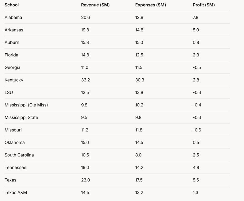 I asked grok to create a chart for SEC schools. This is 2023 data so it's different than the OP. Grok says it does not have access to all 2024 data. Alabama is doing this right.
