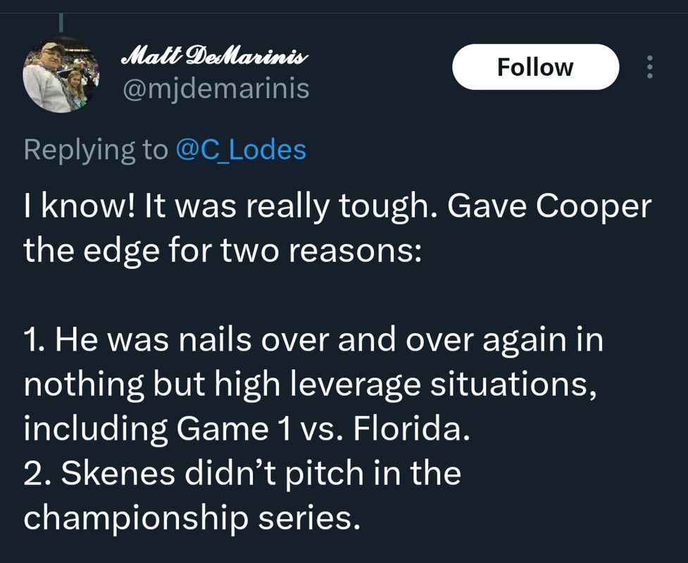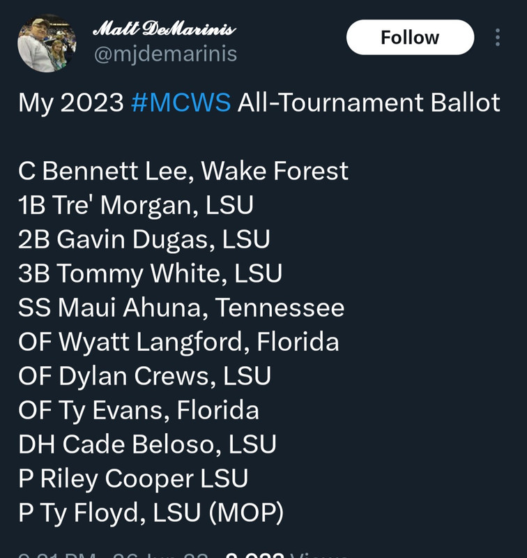 Ty Floyd, Skenes, and Cooper were all deserving of being on the all tournament team. I do understand how it is hard to give the MOP to Skenes when he didn't pitch in the CWS Championship series but he was so dominant in the other 2 games its really hard not to give him the edge. In a perfect scenario he pitches 1-3 innings to close out game 3 and then its a no brainer.