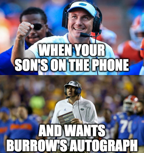 "Florida Head Coach Dan Mullen as he watches Joe Burrow drop a dime to Ja'Marr Chase to go up 42-28 in the 4th quarter"