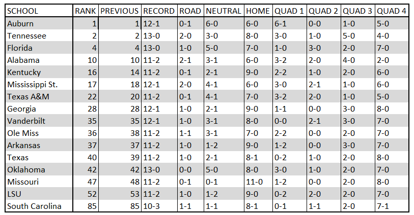 Here is a little something I am trying to keep up with this season with the SEC and NET Rankings. Sorted by NET