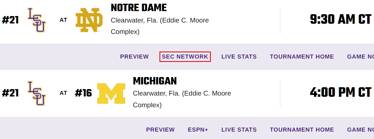 Softball: 2 games today 2/19 - Notre Dame vs LSU SECN 9:30 am, Michigan vs LSU 4pm ESPN+