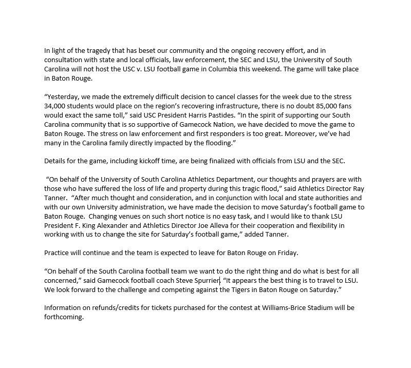 “In the spirit of supporting our South Carolina community that is so supportive of Gamecock Nation, we have decided to move the game to Baton Rouge. The stress on law enforcement and first responders is too great. Moreover, we’ve had many in the Carolina family directly impacted by the flooding.”