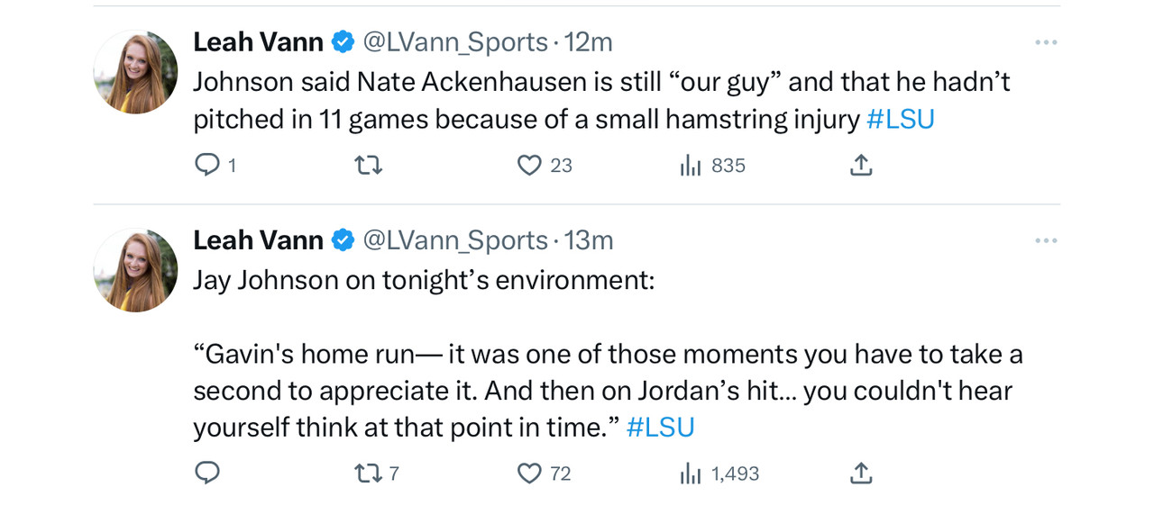 Johnson on Dollander: "I saw a few 98s on the board — the fastball has such good ride and run that if you're not on it, as far as your timing and what you're trying to do with direction, he is going to eat everybody. We were on it and it was still hard. I'm looking up there in the fourth inning and we have one hit and I'm like: 'I don't think we've done that bad against this guy.'" #LSU