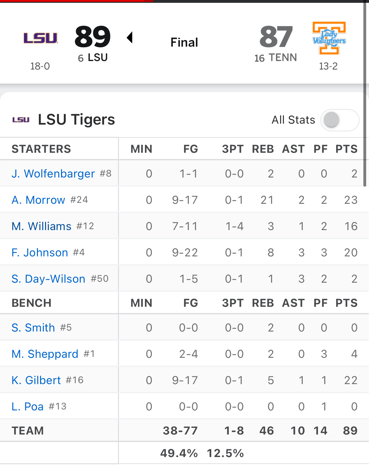That was a fun game to watch. Fast paced, making tough shots in completely different ways...LSU breaking the press and finishing some tough buckets at the rim, Tennessee knocking down 3s left and right when defenders get lost in transition.