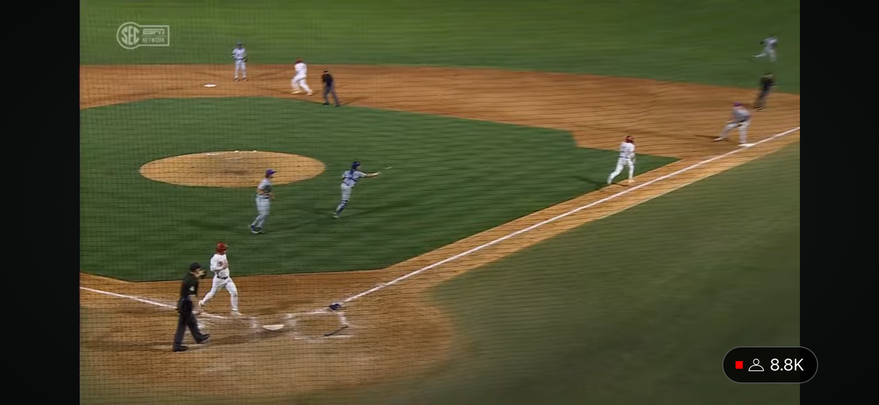 The runners lane is to the right of the foul line. For 80% of his run to 1st, he was to the left of the foul line. By rule, it’s interference. It was bad baseball by LSU, but it was also interference.