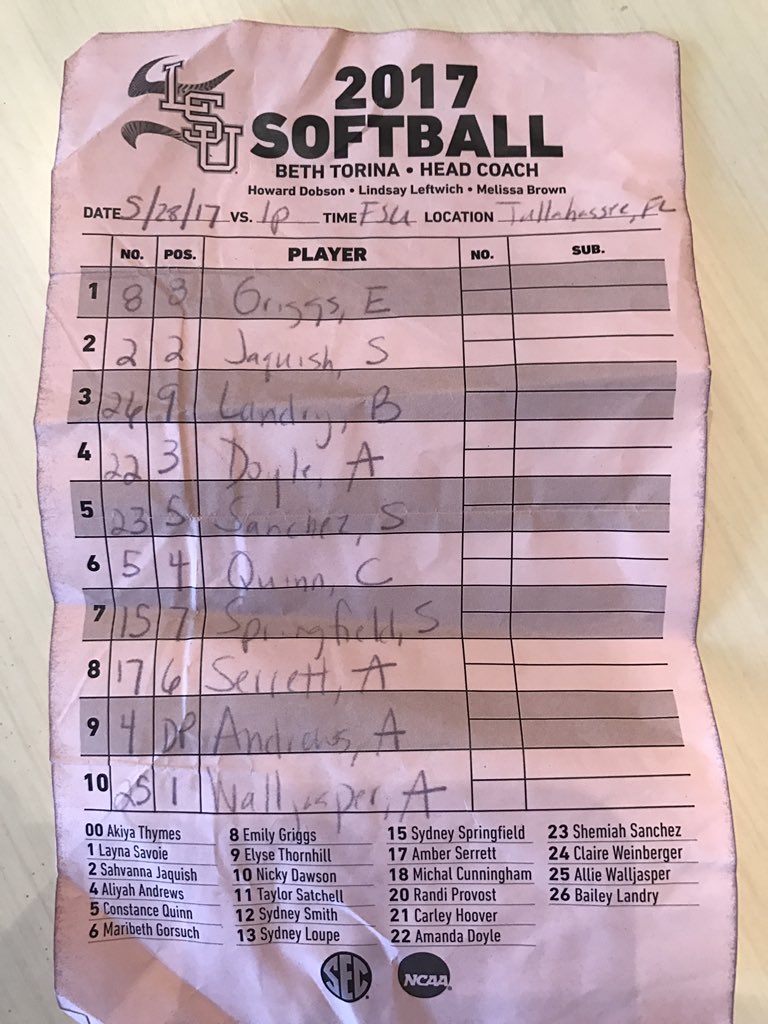 What's up with the lineup card saying Springfield is in left field with Andrews at DP? Some strange relic of softball substitution rules? Edit: Never mind, I see it's from last weekend. However...still...what's up with that? Andrews played in left. Haha.
