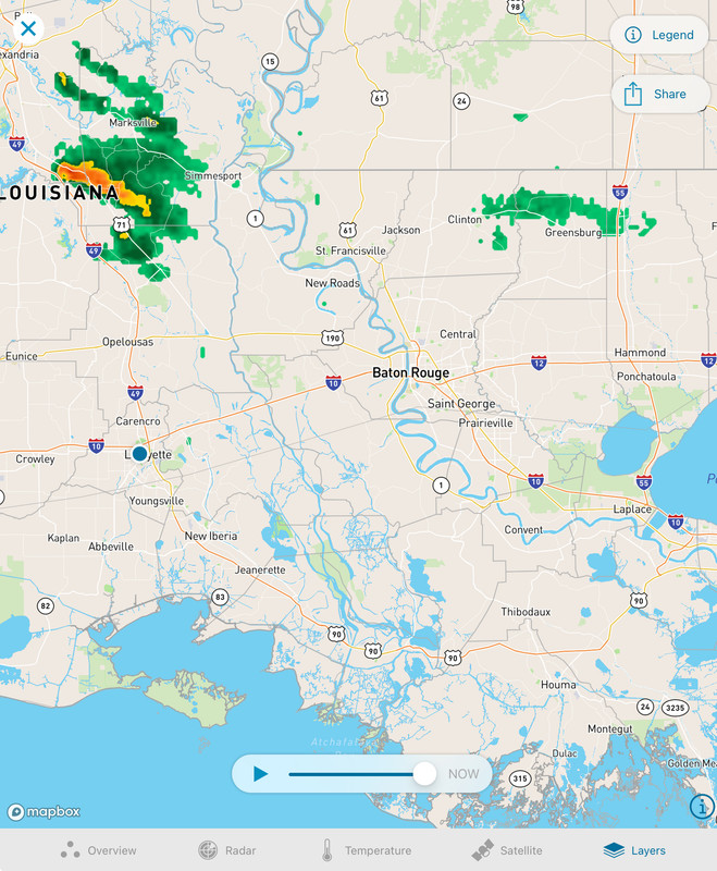 Lightening and heavy rain in the Feliciana parishes north of BTR. It's within 10 miles, and moving south. Doubt the game has any rain. The Lightening is another matter.