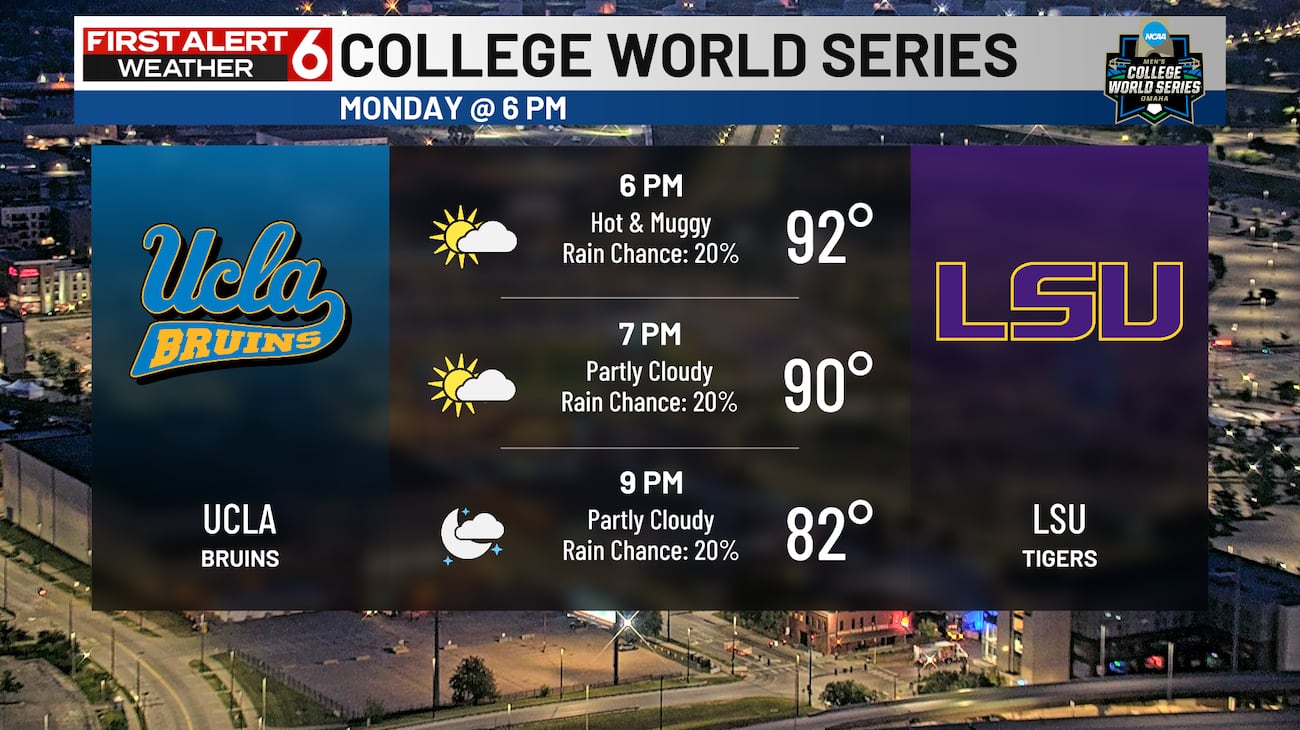 It will be toasty for the afternoon and evening College World Series games but it should remain dry.