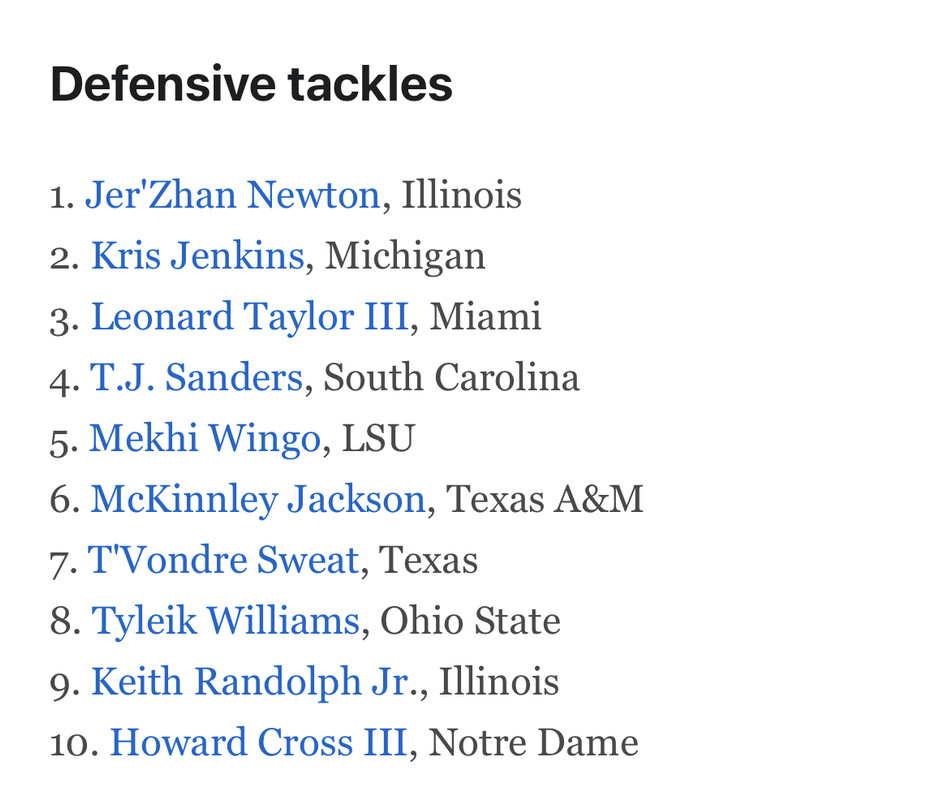 He is no longer listed in Kiper’s top 10 prospects at DT.
