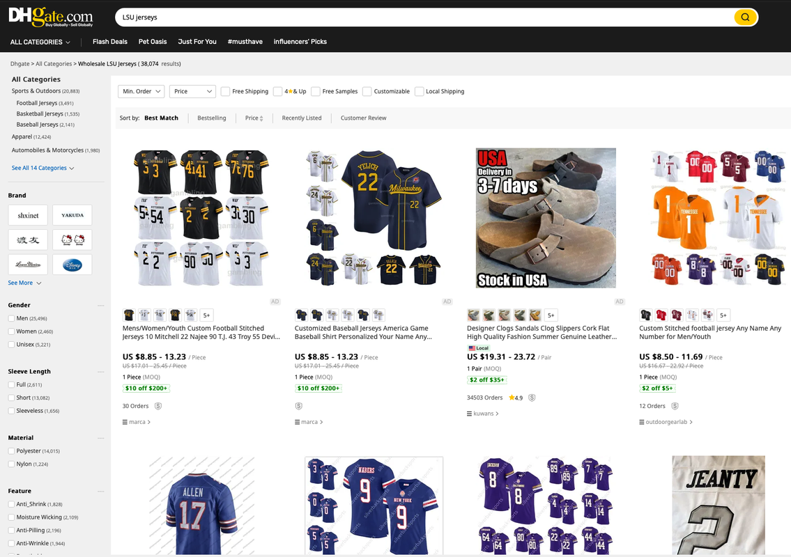 Unless there is another DH Gate, this one does NOT sell NCAA jerseys any more. I wanted the baseball pinstripe, and now it's gone. Lesson learned.