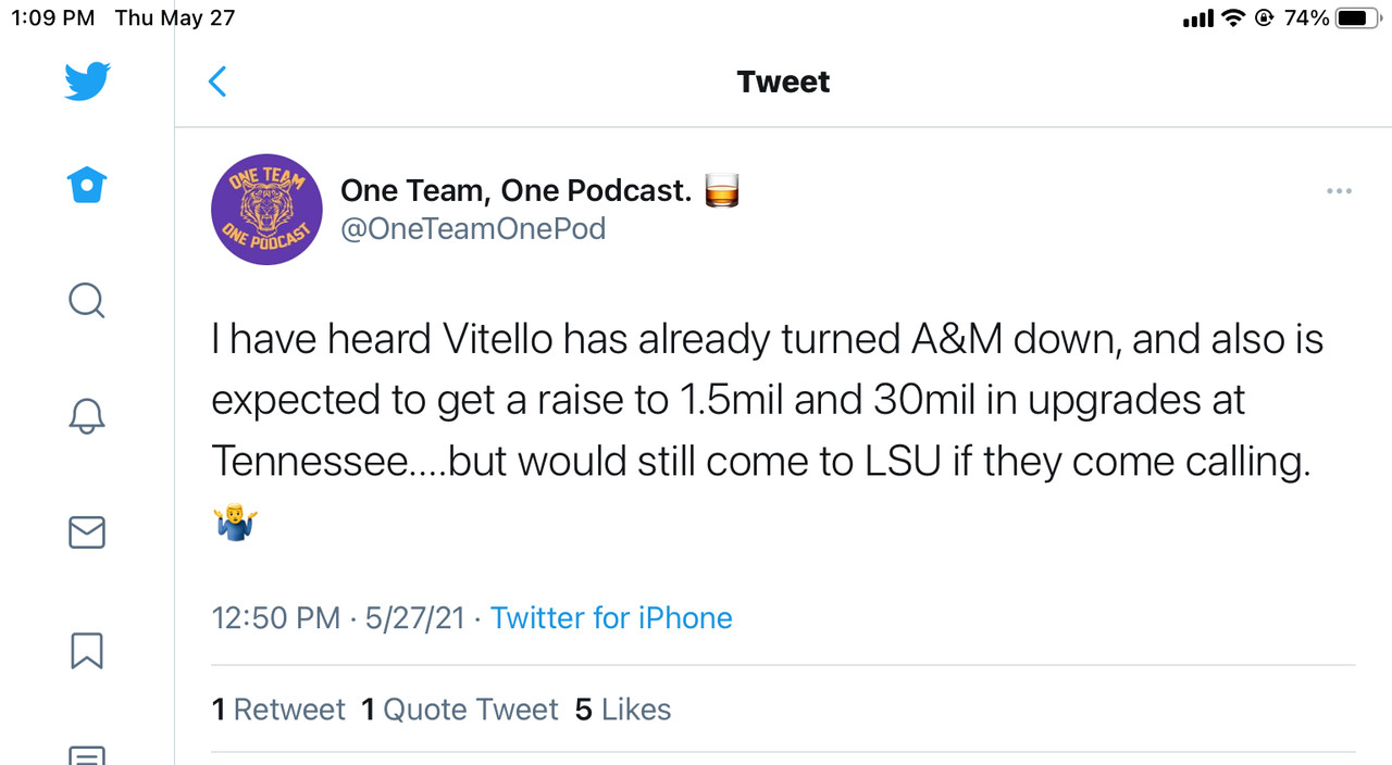 I am from SW Louisiana and friends with a few head ball coaches at the high school level with kids being recruited by all the SEC powers. word has it Kevin O'Sullivan is coming to BR. His current girlfriend is from Lafayette. take it how you wanna take it. geaux tigers