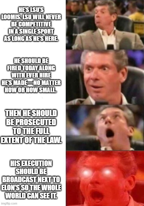 He’s LSU’s Loomis. LSU will never be competitive in a single sport as long as he’s here. He should be fired today along with ever hire he’s made—no matter how or how small. Then he should be prosecuted to the full extent of the law. His execution should be broadcast next to Elon’s so the whole world can see it.